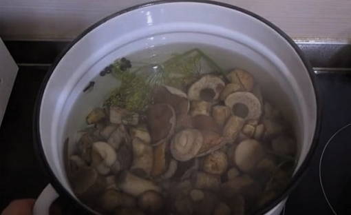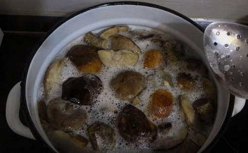 - Daarna wassen we de champignons grondig en koken ze 10 minuten in een liter gezouten water.Het is onwenselijk om boletus boletus te verteren, zodat ze niet verzuren. Gooi de gekookte champignons in een vergiet en spoel ze af met stromend water.