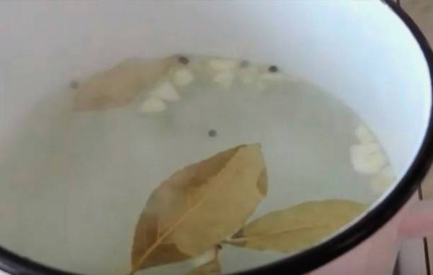 - Kook in een andere pan de marinade uit de hoeveelheid zuiver water, zout en suiker die in het recept staat vermeld. Doe alle kruiden en gepelde knoflookteentjes in de kokende marinade. Onmiddellijk moet je een theelepel azijnessentie gieten.