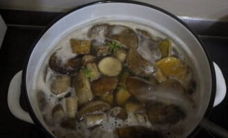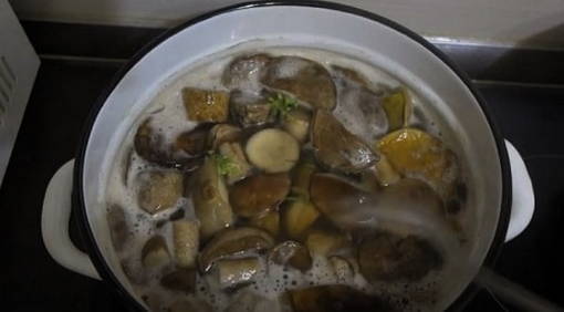 Verwijder vervolgens al het schuim van het oppervlak en kook boletus boletus op laag vuur gedurende 20 minuten. Het eerste water na het koken kan worden afgetapt, maar aangezien paddenstoelen nobel zijn, is dit niet nodig.