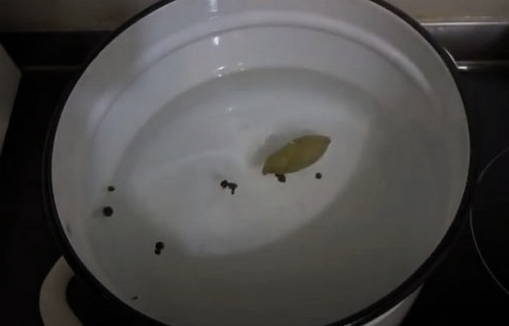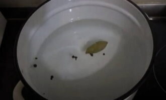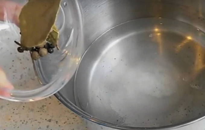 - Kook in een aparte pan de marinade van een liter zuiver water en de hoeveelheid zout, suiker en kruiden zoals aangegeven in het recept. Kook de marinade 2-3 minuten.