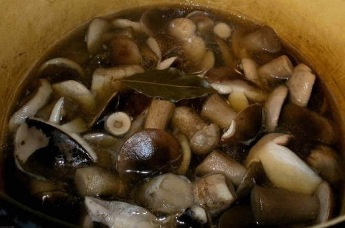 - Breng de gekookte boleetpaddestoelen over naar de gekookte marinade en kook ze 10 minuten vanaf het begin van de kook en op laag vuur. Verwijder vervolgens het laurierblad en kook de champignons nog 10 minuten.