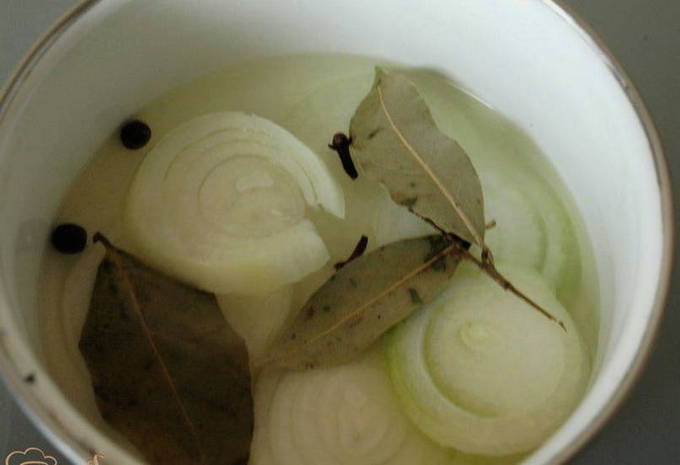 - Kook vervolgens in een andere pan de marinade met de hoeveelheid water, zout en suiker zoals aangegeven in het recept. Doe pimenterwten, laurierblaadjes en gepelde uien in de kokende marinade.Kook de marinade 2 minuten.