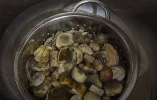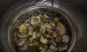 - Gooi de gekookte boletus in een vergiet en spoel af met koud water.