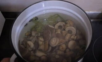 Giet de plakjes champignons met koud water, voeg een beetje zout toe en breng op hoog vuur aan de kook.