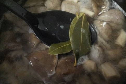 - Doe vervolgens de gekookte boleet in de kokende marinade en verwijder na het koken de laurierblaadjes. Kook de boletus boletus in de marinade gedurende 10 minuten en op laag vuur.