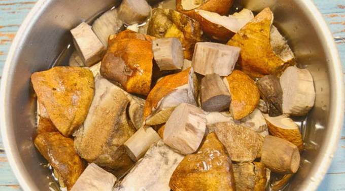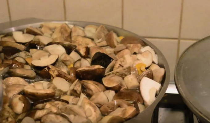 - We snijden de champignons in kleine stukjes, vullen ze met water in een zodanige hoeveelheid dat ze volledig bedekt zijn. We voegen wat zout toe aan het water. We zetten de container met champignons op het fornuis en brengen aan de kook. Kook gedurende een uur, regelmatig het schuim afschuimen.