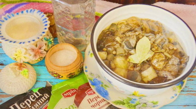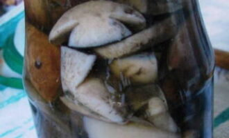- De marinade koken. Giet de aangegeven hoeveelheid water in een pan, voeg zout en suiker toe. Wij mixen. We verspreiden de gekookte aspenpaddestoelen, mengen.We zetten laurierblaadjes, kruidnagel, peperkorrels. Zet de pan op het vuur en breng de inhoud aan de kook. Giet azijn erbij, roer, laat een minuutje op het vuur staan en verwijder.