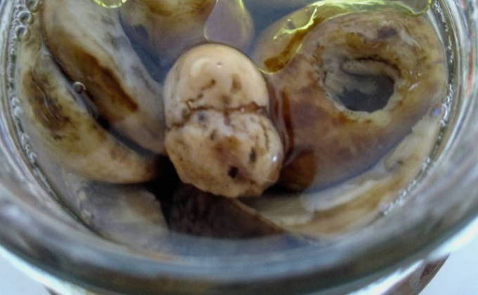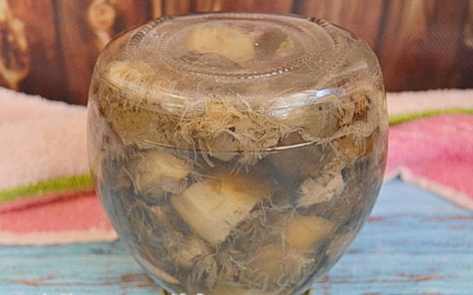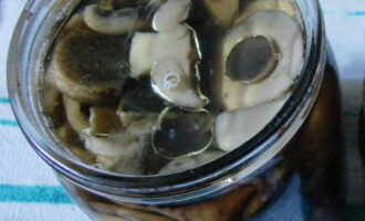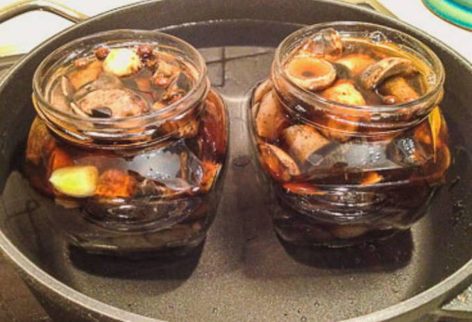 - We doen de paddenstoelen in droge steriele potten, bedekken met droge steriele deksels. Steriliseer gedurende vijftien minuten. Daarna sluiten we de deksels, draaien het ondersteboven om de dichtheid te controleren en laten het volledig afkoelen.