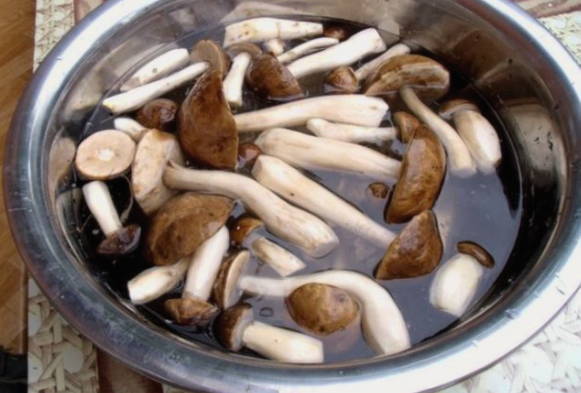 - Giet water voor het koken van boleet in een pan, los hierin zout, suiker en citroenzuur op. We laten de champignons zakken, zetten op het fornuis en brengen aan de kook. We koken tien minuten op laag vuur. Gooi in een vergiet, spoel af met koud water.