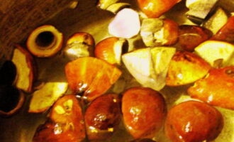 Marineer de boletus met uien. Hiermee wordt elke bereiding sappiger, aromatischer, pikanter. Champignons zijn geen uitzondering. Als je van een uitgesproken uiensmaak houdt, kun je er meer van toevoegen.Voor een lichte afdronk per kilogram boleet zijn twee kleine uien voldoende.