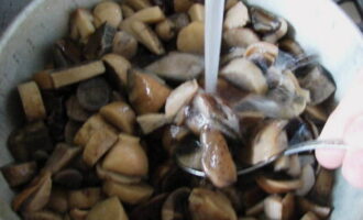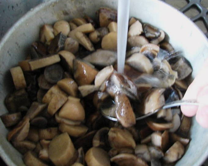 - Na het koken worden de champignons in een vergiet gegooid en goed afgespoeld met water.