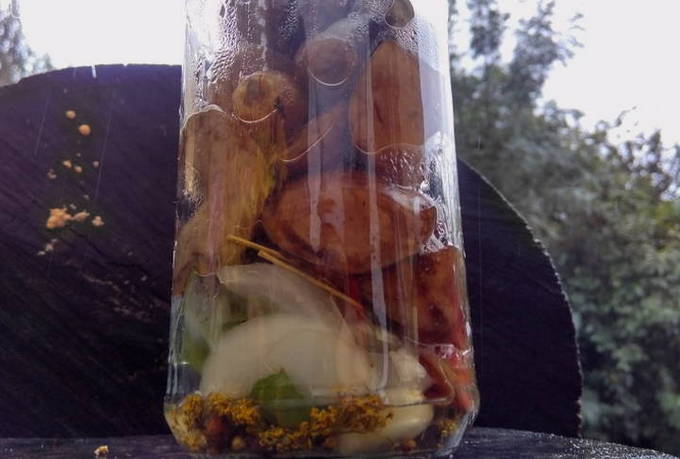 Bij de bereiding wordt niet alleen azijn als conserveermiddel gebruikt. Citroenzuur bewaart ook paddenstoelen goed. Bovendien houdt het de paddenstoelen licht en draagt het bij aan een knapperige textuur. Voor de smaak zullen we ook mosterdkorrels aan de blanco toevoegen.