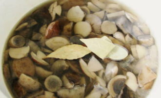 We brengen de boletus terug in een schone pan, vullen hem met water in een zodanige hoeveelheid dat hij ze bedekt, voegen laurierblaadjes, peper, kruidnagel en de aangegeven hoeveelheid zout toe. Breng aan de kook, wacht tot de champignons beginnen te bezinken. Voeg azijn toe, kook al roerend een paar minuten.