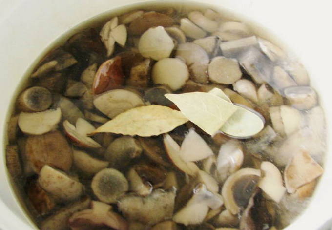 - We reinigen en wassen de champignons goed - de vruchtlichamen moeten absoluut schoon zijn. Scheid desgewenst de hoeden en poten om ze apart te marineren. Grote exemplaren snijden we in kleine stukjes. Giet de aangegeven hoeveelheid water in de pan, voeg zout toe, breng aan de kook. Dompel de voorbereide champignons in een kokende pekel, laat het koken. Kook gedurende vijf minuten op laag vuur en schep het schuim eraf.