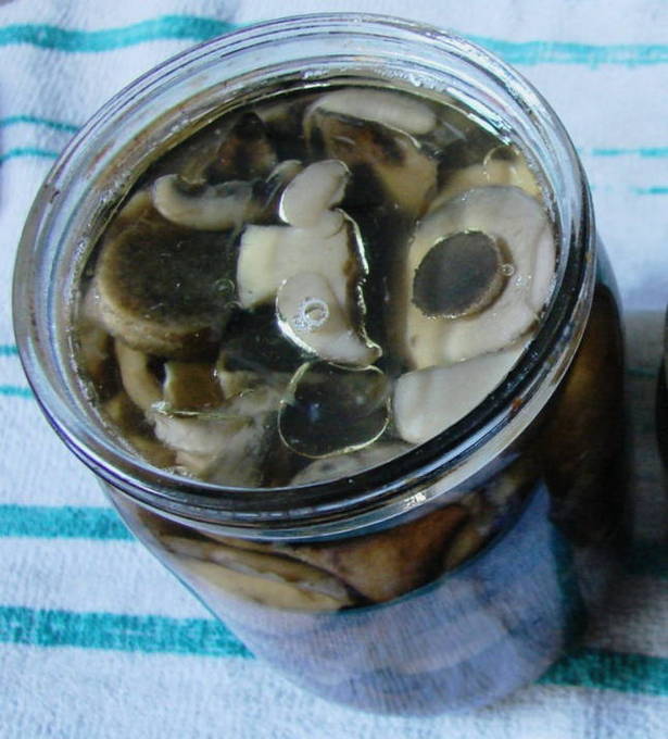 - We leggen de kant-en-klare champignons in droge, voorgesteriliseerde potten, sluiten af met droge steriele deksels, laten ze volledig afkoelen en bewaren ze in de koelkast.