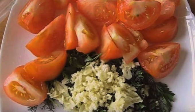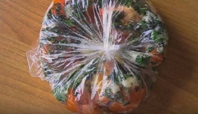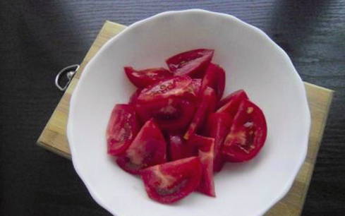 - Snijd de tomaten in plakjes, leg ze in lagen in een kom, bestrooi met kruiden en giet de marinade erbij. Laat de container met tomaten 8-10 uur marineren in de koelkast.
