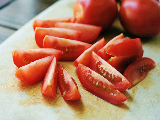 - Was de tomaten en snijd ze in partjes.