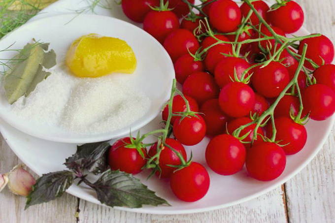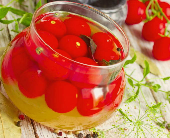 Ingelegde kerstomaatjes zijn een mooie en smakelijke bereiding, en het is ook handig om het in één hap op te eten. De rijke smaak en geur van de marinade maakt tomaten licht gezouten en licht kruidig.