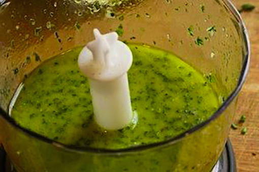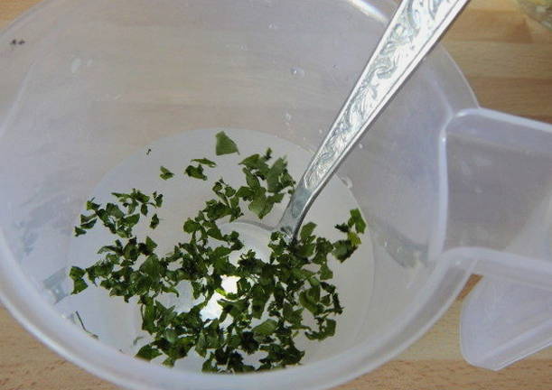 - Meng in een kom gehakte peterselie, knoflook, zout, suiker, gemalen peper en water.