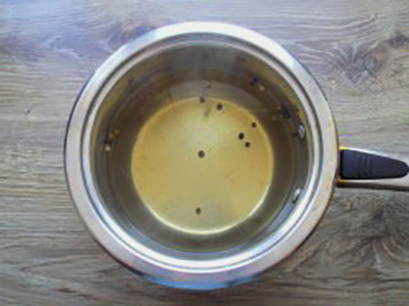 - Giet water in een pan, zet het in brand. Giet suiker en zout in het water, voeg zwarte en pimenterwten toe. Breng de marinade aan de kook en kook 2-3 minuten. Voeg vervolgens azijn toe, roer en haal van het vuur.