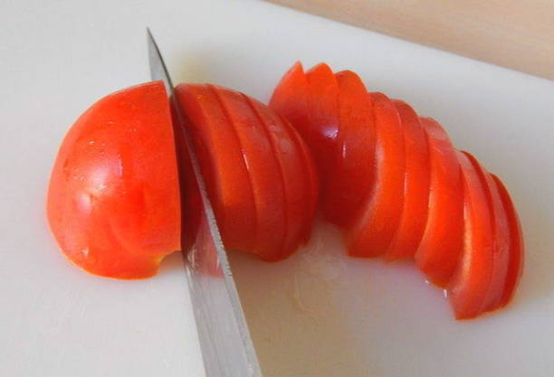 - Was de tomaten en snijd ze in plakjes. Breng ze over naar de wortelen.