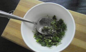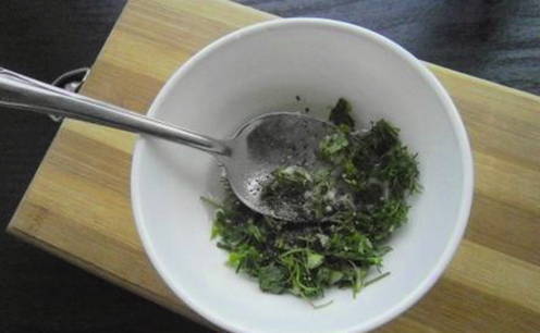 Hak de peterselie en dille fijn. Pel de knoflook en passeer door een pers. Voeg kruiden en knoflook toe aan de marinade en meng goed.