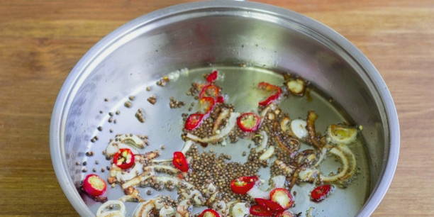 - Bereid de marinade voor. Giet plantaardige olie in een voorverwarmde koekenpan, bak de uien erin, snijd ze in halve ringen. Voeg vervolgens hete pepers en korianderzaad toe. Bak alles een paar seconden samen.