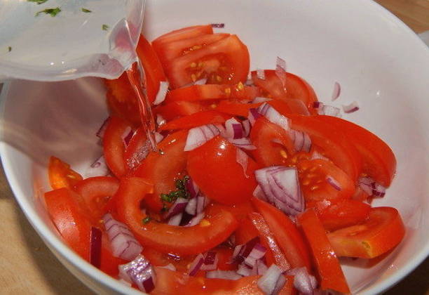 - Meng uien en tomaten in een kom, bedek met marinade en zet een half uur in de koelkast.