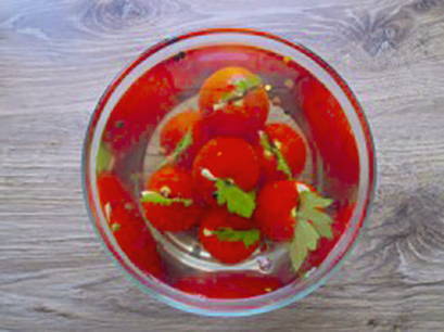- Doe de tomaten in een diepe kom en bedek ze met de hete marinade. Als de marinade is afgekoeld, leg je de tomaten in de koelkast.