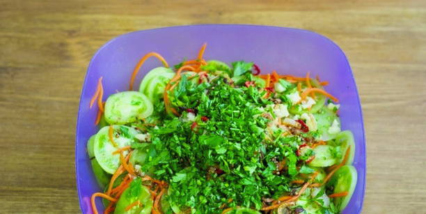 - Voeg ook gehakte kruiden en azijn toe, meng goed. Druk de groenten met een lading aan en zet ze 10-12 uur in de koelkast.