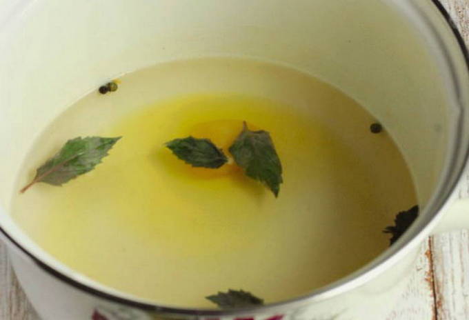 - Nadat de marinade is afgekoeld, giet het in een pan, breng het aan de kook, voeg honing, azijn en basilicum toe. Roer de marinade totdat de honing volledig is opgelost.