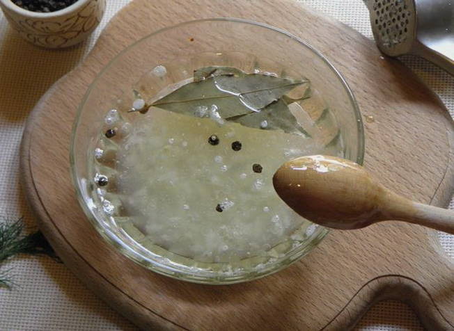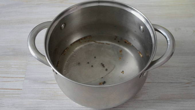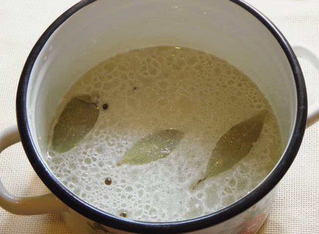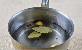 Giet water in een pan van geschikte grootte en steek in brand. Breng aan de kook en schep het laurierblad en de peper erdoor. We koken alles ongeveer 5 minuten.