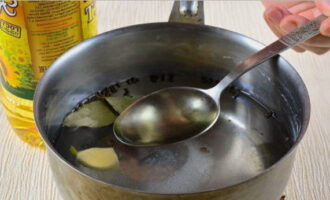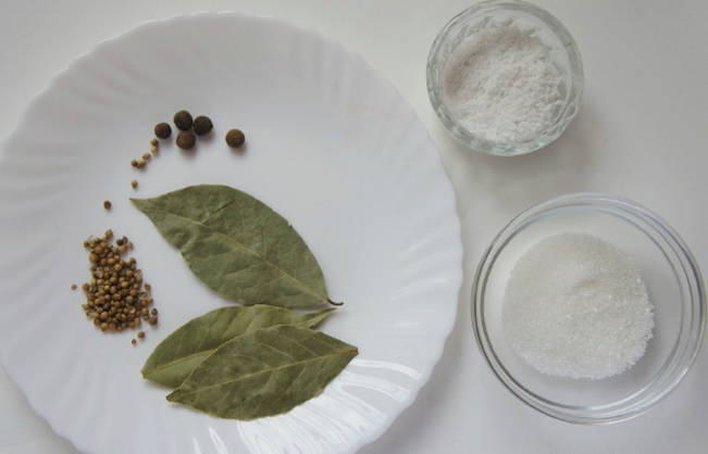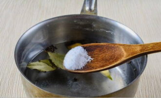 - Laten we beginnen met het bereiden van de marinade. Giet water in een pan en stuur het naar het vuur. Voeg zodra het water kookt suiker, zout, laurier, peper en koriander toe. Wij mixen alles.