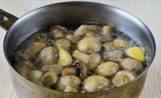 - Gedurende deze tijd werden champignons gekookt. We halen ze uit het water met een schuimspaan om overtollig vocht kwijt te raken. Je kunt ook een vergiet gebruiken. We verplaatsen de champignons naar de marinade.