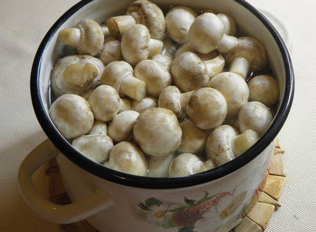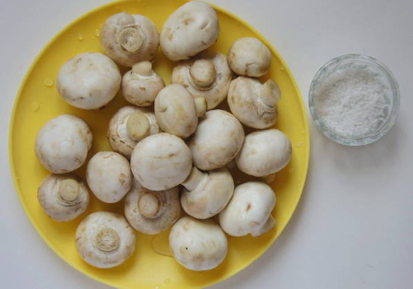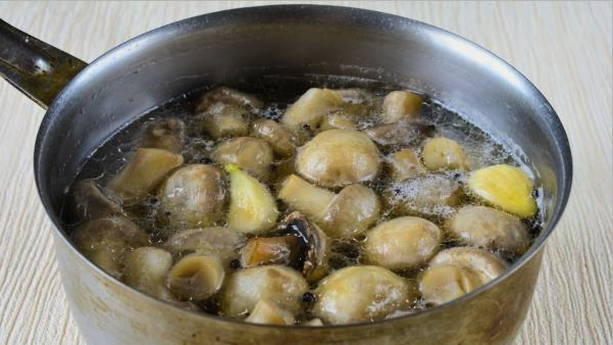 - Was de paddenstoelen grondig onder water om al het vuil te verwijderen. We hebben ook de uiteinden van de paddestoelpoten afgesneden. Neem vervolgens een geschikte pan, giet er water in en voeg een eetlepel zout toe. We steken het vuur aan en wachten tot het water kookt. Dan sturen we de champignons daarheen en koken ze ongeveer 10 minuten. Doe de kant-en-klare champignons in een vergiet en giet de pekel eruit. We brengen de champignons over naar een aparte container.