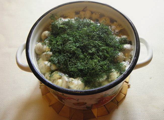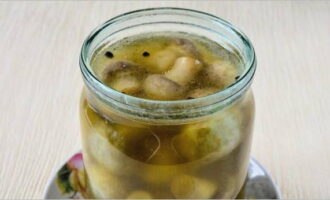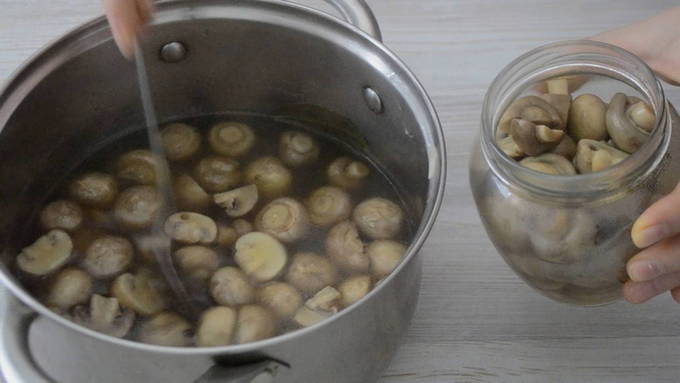 Haal na deze tijd de pan van het vuur en laat hem volledig afkoelen. Alleen dan kunnen we beginnen met het uitzetten van de paddenstoelen. Vul eerst het geschikte glas met champignons en giet de pekel erover. We bewaren de afgewerkte snack in de koelkast.