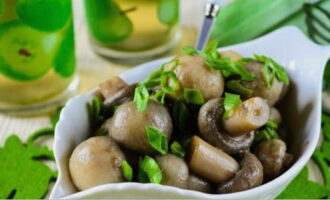 De marinade voor deze paddenstoelenbereiding is gemaakt van plantaardige olie, azijn, sojasaus, koriander, peper, laurierblaadjes, kruiden, sesamzaad, knoflook en zout. Zo'n set ingrediënten geeft het voorgerecht een kruidige en oosterse smaak.