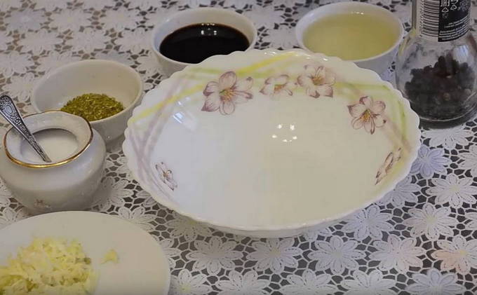 - Laten we beginnen met het bereiden van de marinade. Giet plantaardige olie, sojasaus en azijn in een diepe bak. Hak de peterselie fijn en voeg toe aan de kom. Voeg vervolgens koriander, zwarte peper, hete peper, laurier en fijngehakte knoflook toe. We mengen alles grondig en proeven.Voeg eventueel zout toe.