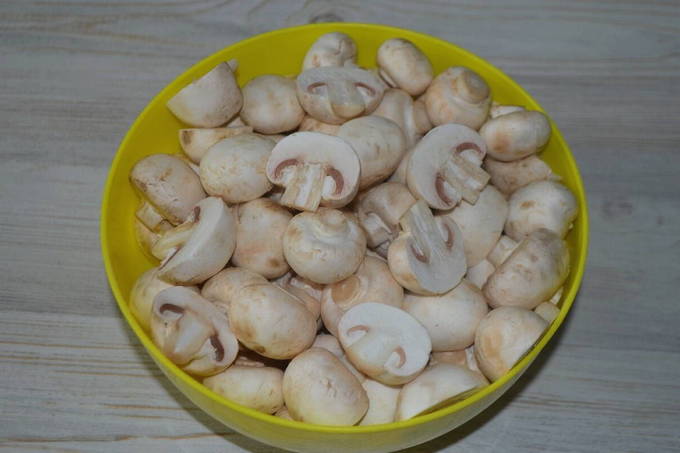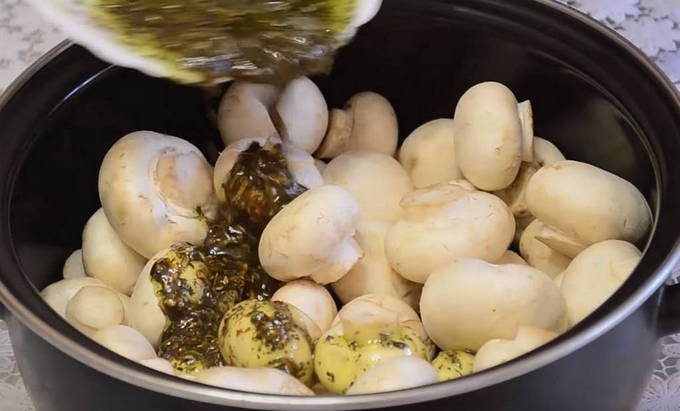- We schuiven de champignons in een diepe bak en vullen ze met marinade. Roer tot elke paddenstoel bedekt is met saus. Laat 20 minuten marineren.