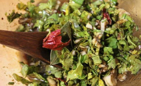 - Meng in een handige container plantaardige olie, azijn, zout, laurier en zwarte peper. Haal de knoflook door een pers of hak hem heel fijn en voeg toe aan de rest van de ingrediënten.