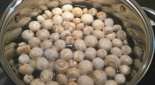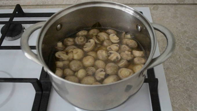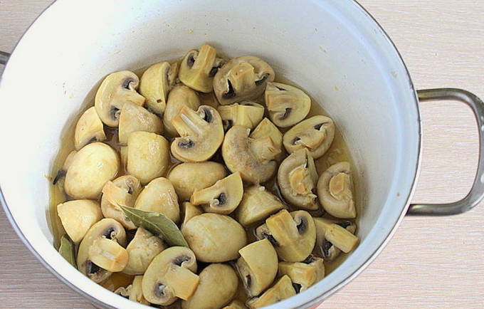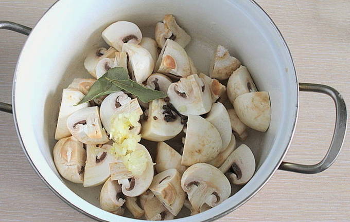 - Kleine champignons zijn het beste voor dit recept. Was de champignons grondig onder water. Giet water in een pan, voeg zout, laurier en peper toe. We brengen aan de kook en doen de champignons in het water. Kook gedurende 15 minuten.