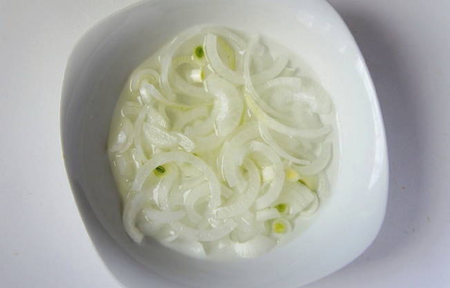 - Eerst beginnen we met het inleggen van de uien. Eerst maken we het schoon en snijden het in halve ringen. We verplaatsen het naar een aparte container en vullen het met azijn erop.