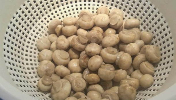 - Voor dit recept kun je het beste kleine champignons gebruiken. We wassen de champignons goed onder water en laten ze drogen.