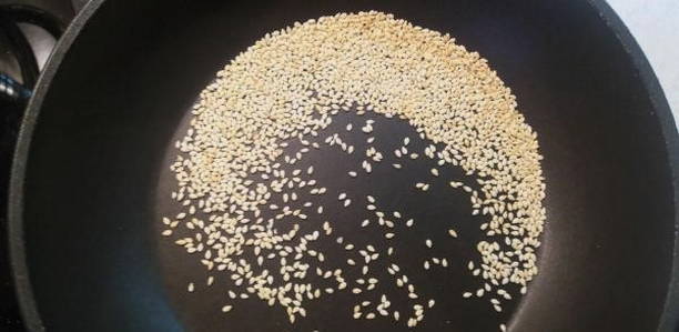 - Giet sesamzaadjes in een droge koekenpan en bak ze goudbruin. Het is belangrijk om het niet te gaar te maken, want het kookt erg snel.