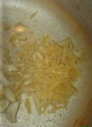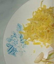 - Verhit alle olijfolie in een koekenpan en voeg er zout, knoflook, citroenschil aan toe. Verwarm ongeveer 3 minuten op laag vuur, af en toe roeren.