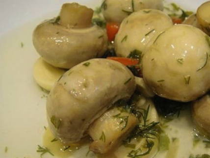 Dit recept gebruikt zout, suiker, koriander, kruidnagel, pepers, knoflook, laurierblaadjes, olie en azijn voor de marinade. Er wordt tijd bespaard doordat de champignons gelijktijdig met de marinade worden gekookt. Je hoeft de champignons alleen in de koelkast te laten afkoelen.