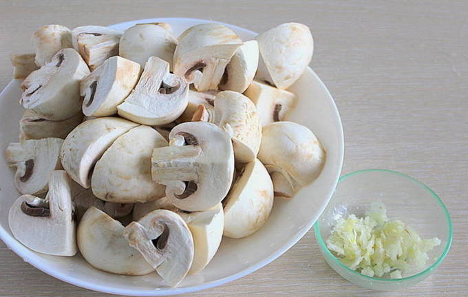 - Was de champignons grondig en laat ze drogen op keukenpapier. Snijd indien nodig het onderste deel van het been af. Hak de knoflook fijn met een mes of haal door een pers. We nemen een geschikte container en sturen knoflook, plantaardige olie, balsamicoazijn, zout, peper, suneli-hop en Provençaalse kruiden daarheen.