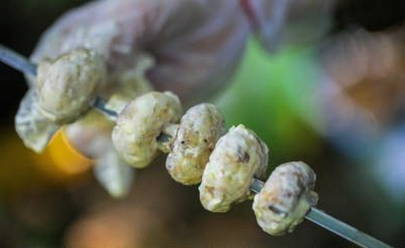 - Nu rijgen we de champignons aan spiesjes.