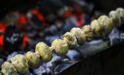 - Champignons ongeveer 15 minuten op de grill bakken. De kolen moeten goed worden verwarmd. Draai de spiesen regelmatig om totdat er een gouden korst verschijnt. We controleren de gereedheid door een klein stukje van de paddenstoel af te snijden. Serveer kant-en-klare champignons met verse groenten of saus. Eet smakelijk!