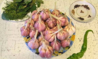 Laten we de knoflook bereiden. We reinigen de koppen van overtollige kaf, spoelen en drogen ze vervolgens grondig.